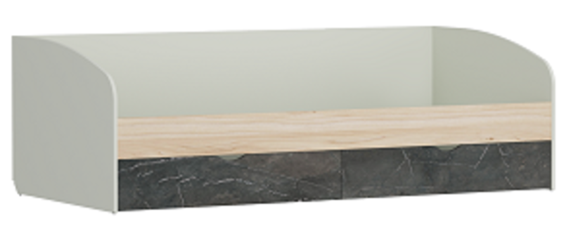 Кровать состоит из ножной и головной спинок прямоугольной формы с закругленной фасадной стороной, соединены задней вертикальной стенкой и царгой с жестким основанием, состоящим из заглушки из плиты древесно-стружечной с зазорами для выхода воздуха, под основанием расположены два наружных выдвижных яшика.