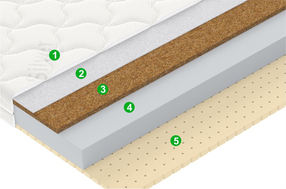 Ассиметричная модель на основе латекса, кокосовой койры и современного дышащего пенного материала позволит вам выбрать комфортную степень жесткости, учитывая положение ребенка.