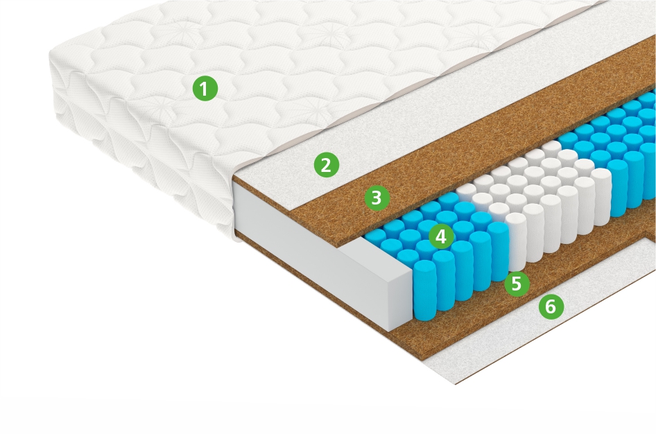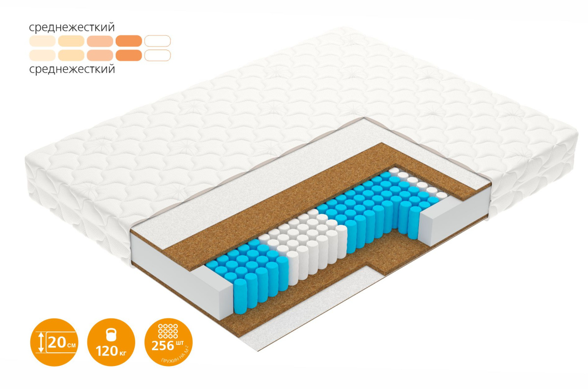 В этой модели жесткость кокосовой койры сбалансирована упругостью независимых 5-зональных пружин, гибко подстраивающихся под форму тела. Такая конструкция обеспечивает правильную жесткую поддержку, сохраняя комфорт отдыха. Матрас Focus – для тех, кто сосредоточен на заботе о здоровье.