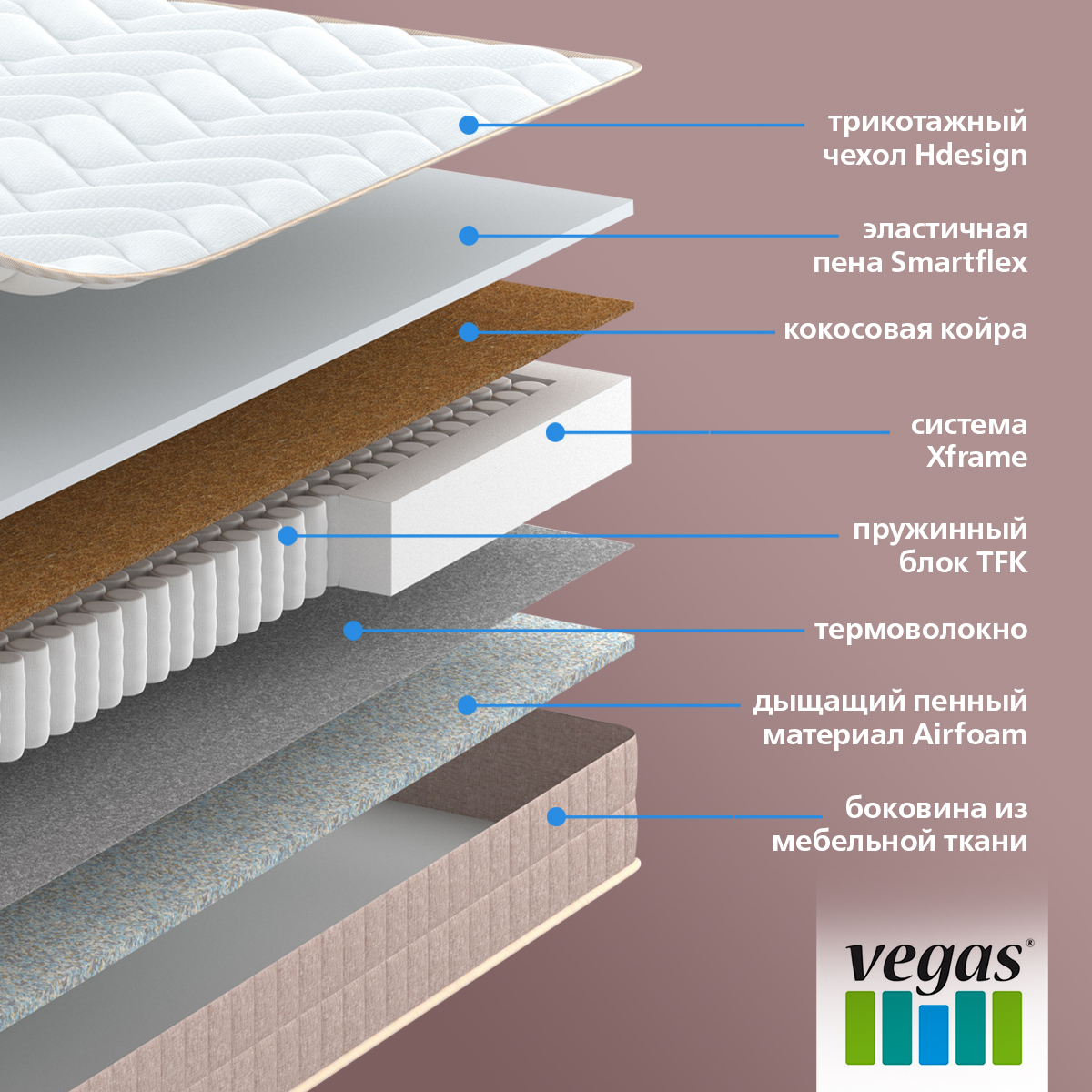 - Чехол Hdesign: несъемный чехол из трикотажной ткани повышенной плотности, устойчивой к появлению катышек и затяжек. Боковые части чехла выполнены из плотной мебельной ткани песочного оттенка с рисунком-имитацией рогожки и дополнены кантом. Для простого ухода за матрасом рекомендуем приобрести защитный наматрасник из коллекции Vegas Protect.