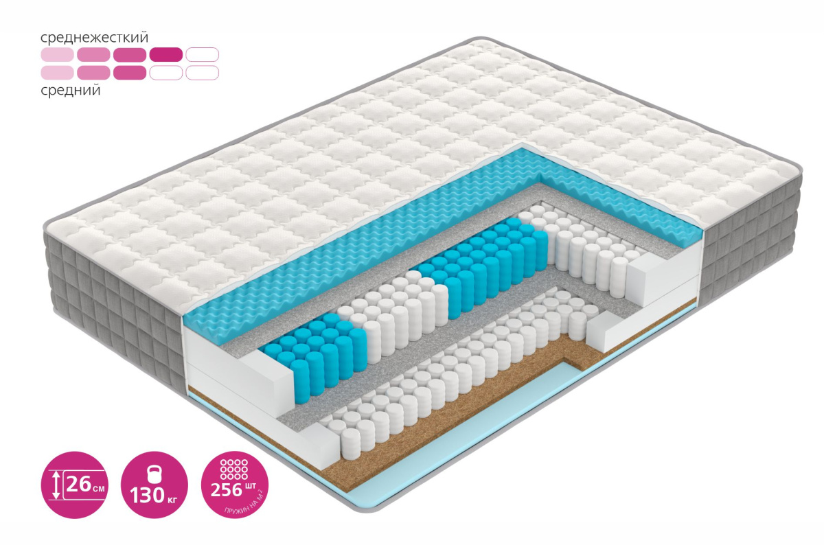 Роскошный высокий (26 см) матрас с двумя пружинными блоками: инновационной системой Smartpocket Pro 5-Zone с пятью зонами комфорта и блоком TFK Mini R1000, усиливающим ортопедический эффект матраса. Средняя по жесткости сторона выполнена из упругой пены с микромассажным эффектом, дающим дополнительное расслабление во время отдыха. Среднежесткая сторона матраса продуманно сочетает природную жесткость кокосовой койры с мягкой упругостью современной пены Smartflex.