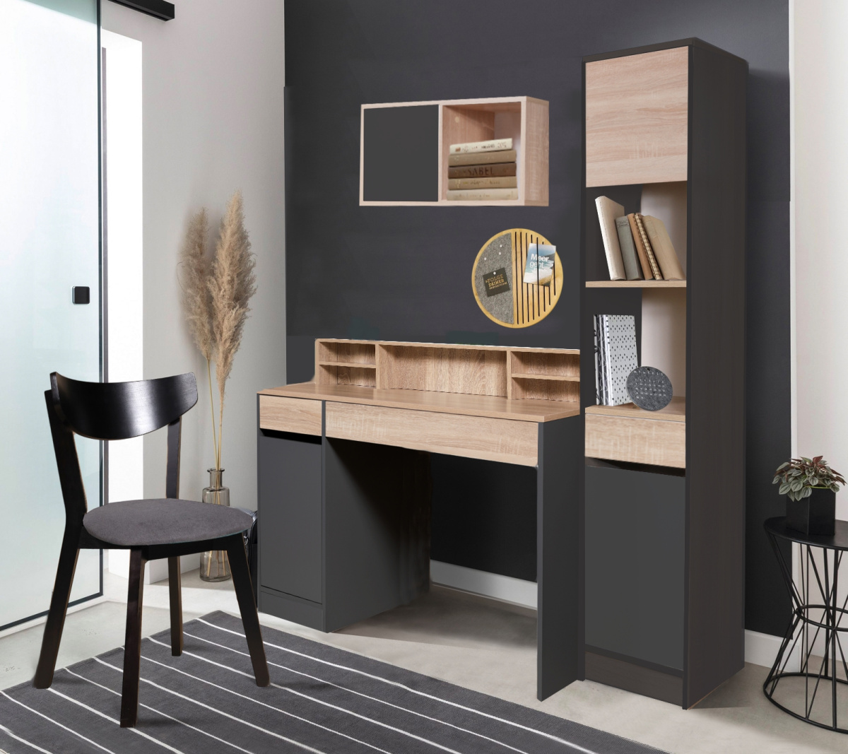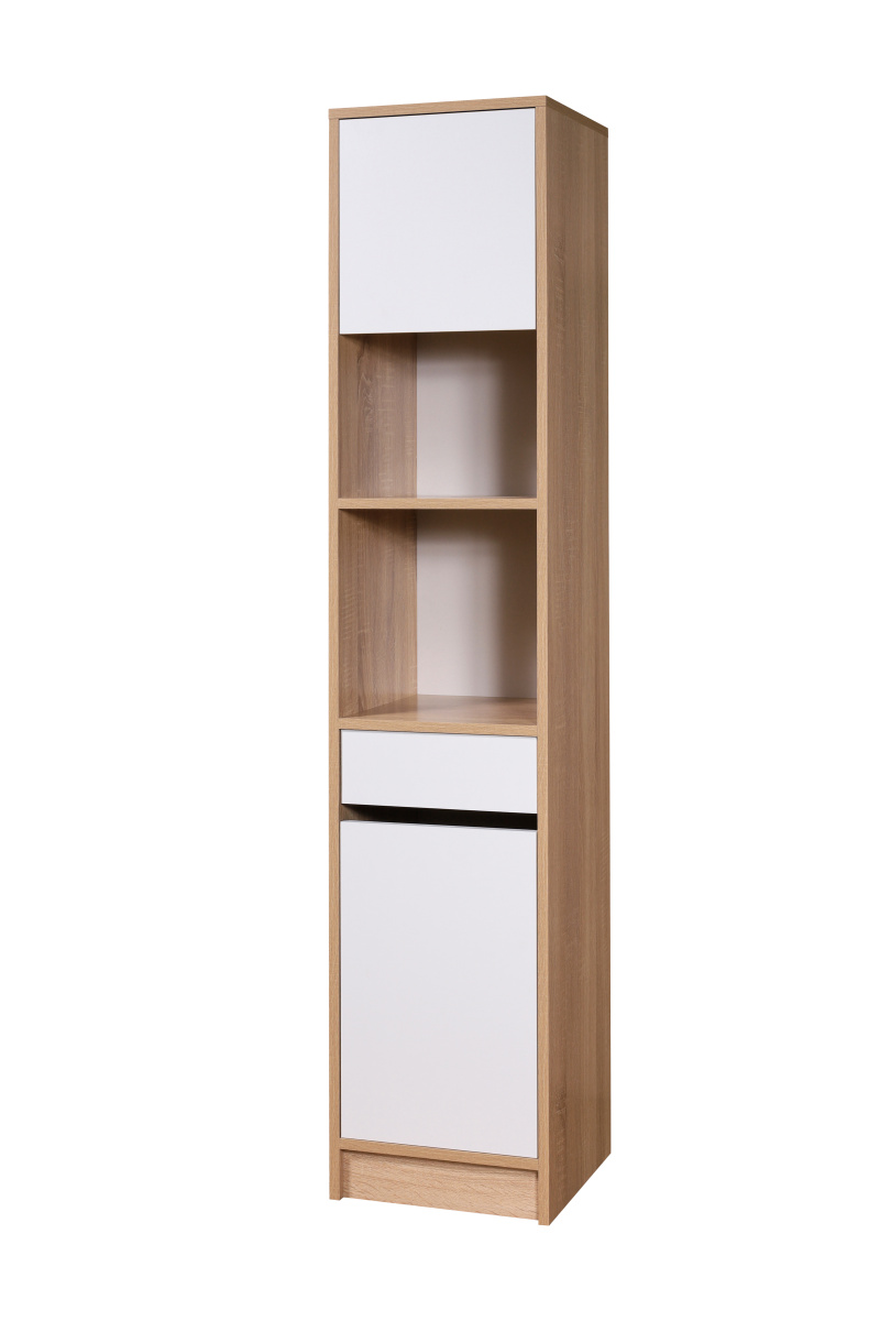 Стеллаж укомплектован выдвижным ящиком и двумя закрытыми секциями с дверями. Нижняя секция разделена полочкой. Также есть открытая ниша, в которой разместятся книги или предметы декора.