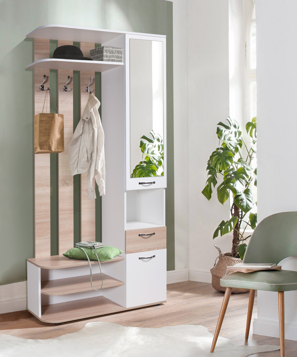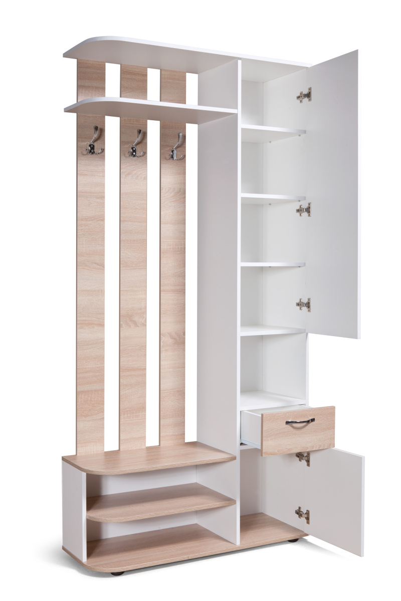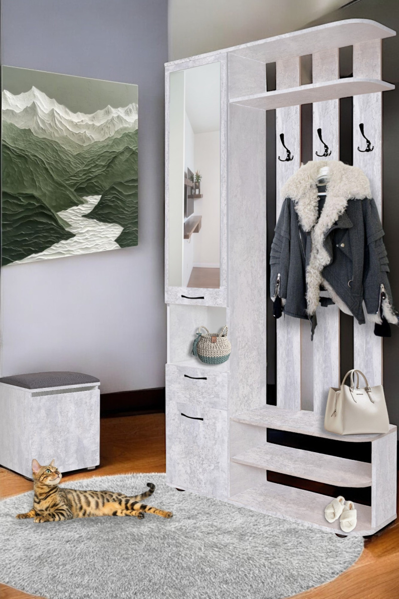 Простая и компактная прихожая вместительна и функциональна, позволит разместить все необходимые вещи: обувь, верхнюю одежду, головные уборы и различные мелкие вещи. Благодаря гармоничному сочетанию цветов прихожая создаст в вашей квартире ощущение уюта, тепла и комфорта.