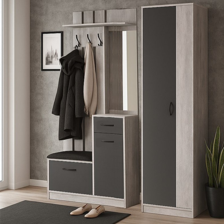 Шкаф Дейтон прекрасно комплектуется с набором для прихожей Порто. При необходимости можно увеличить места хранения с помощью шкафа Порто-1 и/или тумбы Порто-6.