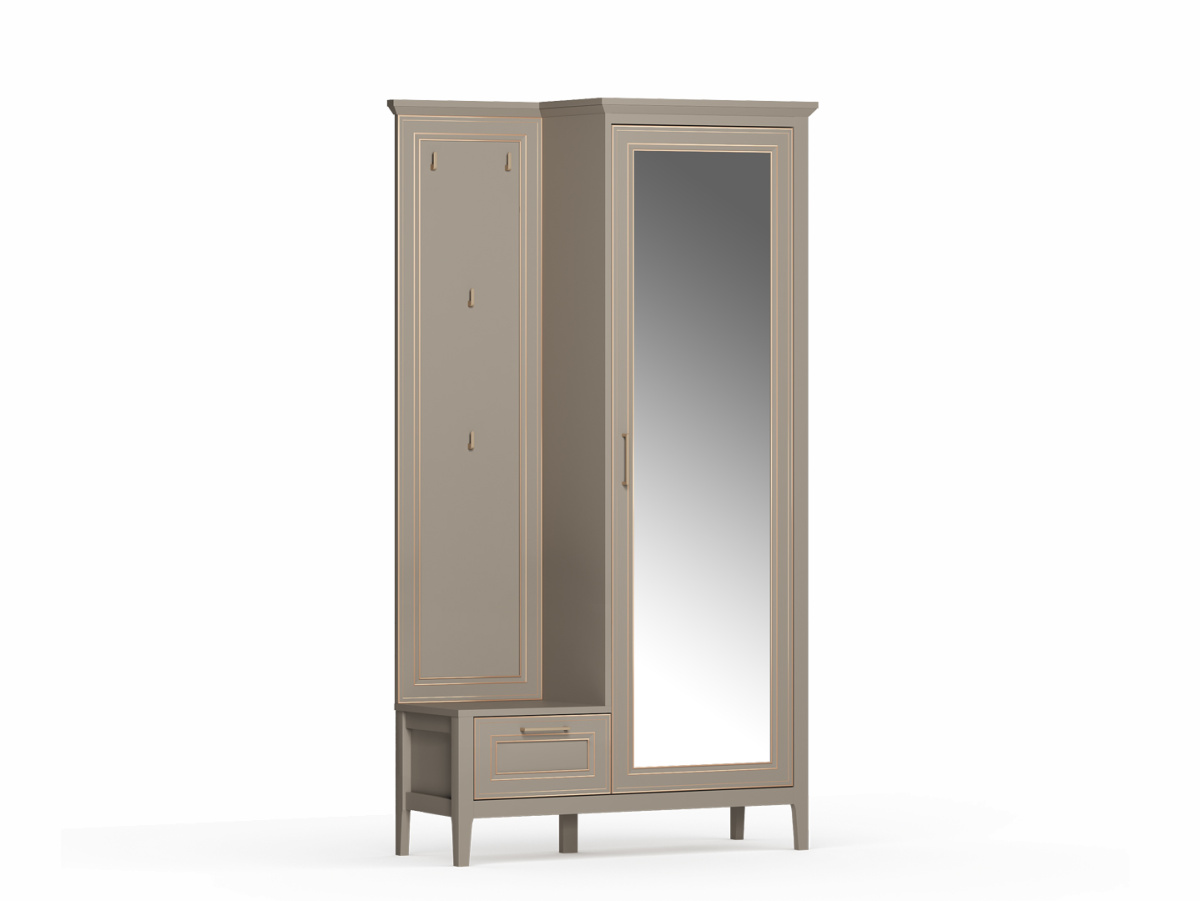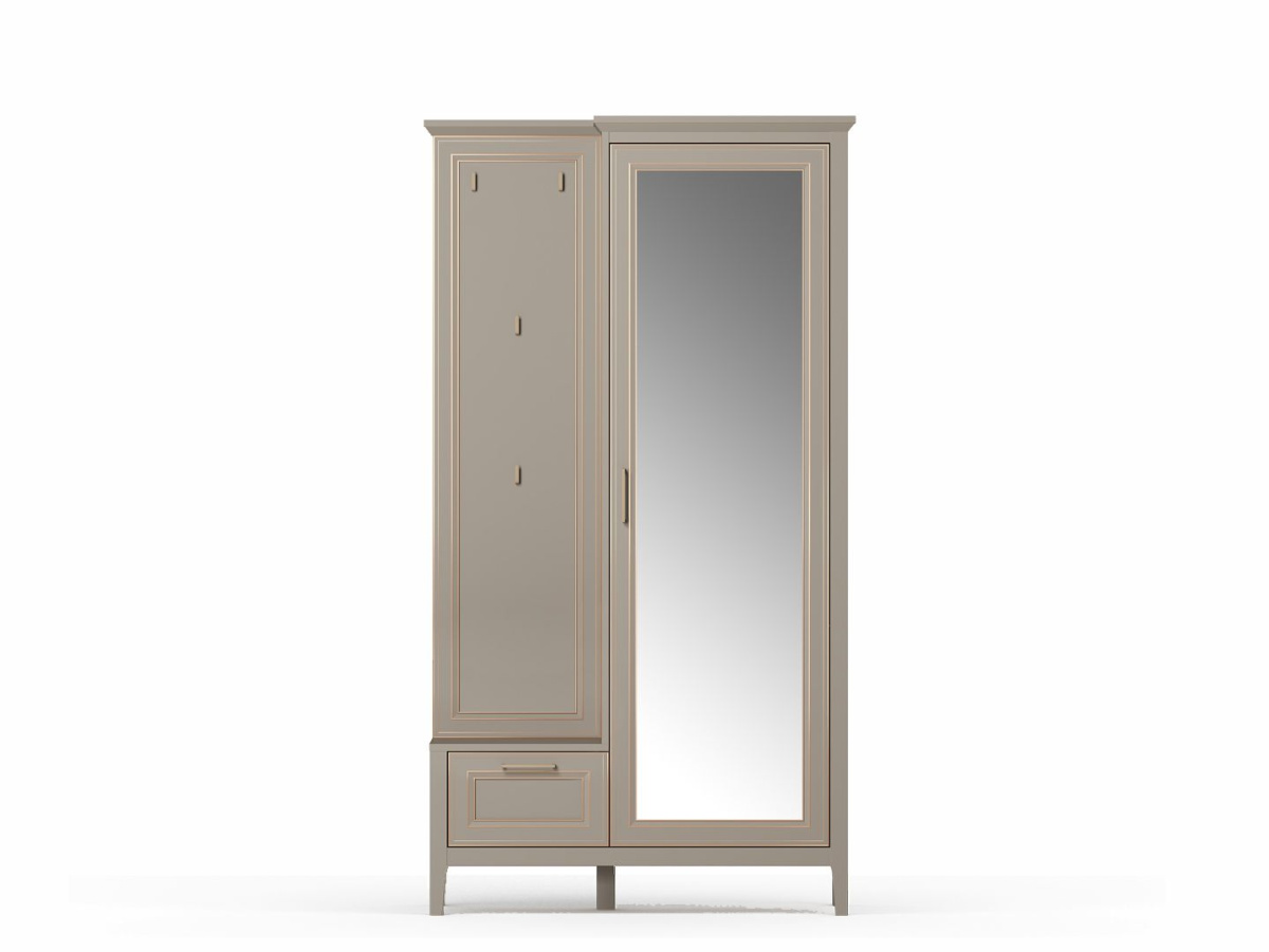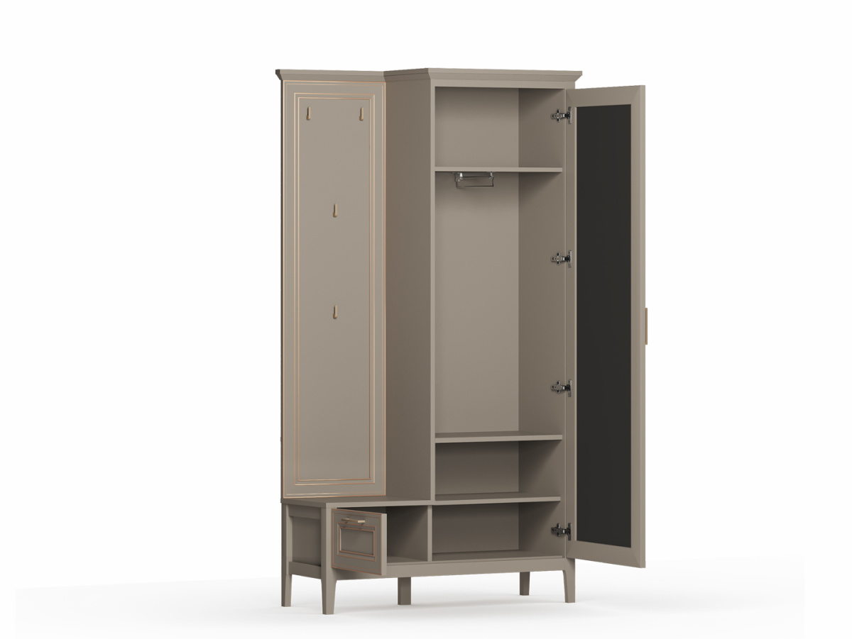В правой части шкафа расположено отделение с выдвижной металлической вешалкой за дверью с зеркальной вставкой;