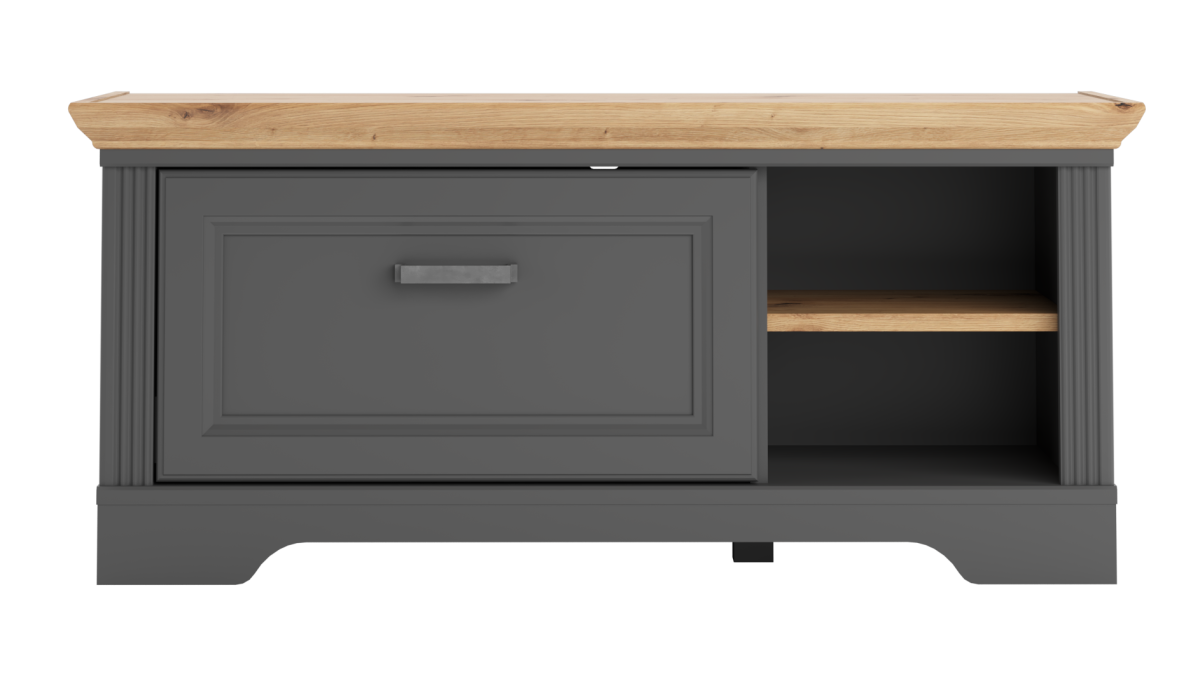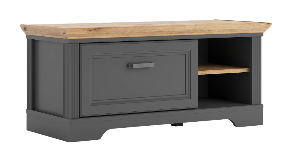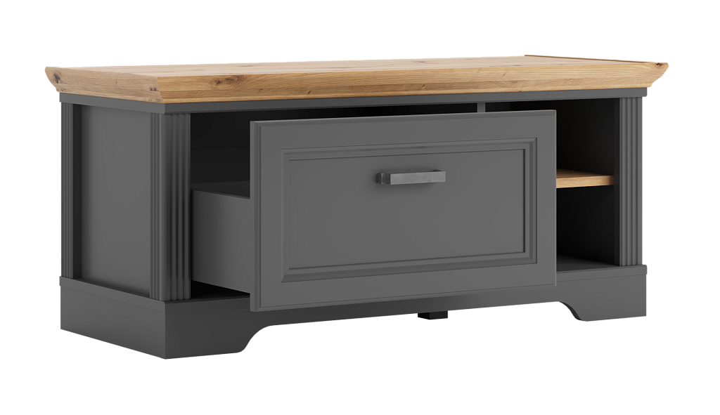 В левой части тумбы расположен выдвижной ящик на шариковых направляющих, в правой — открытые отделения для хранения;