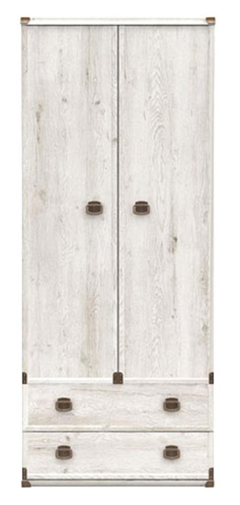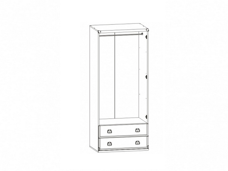 Шкаф разделен на 2 отделения: верхнее –отделение с распашными дверями, за которыми расположена стационарная штанга для одежды, нижнее – 2 выдвижных ящика на металлических роликовых направляющих;