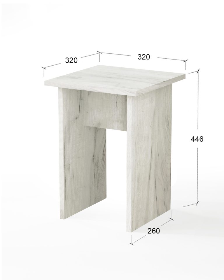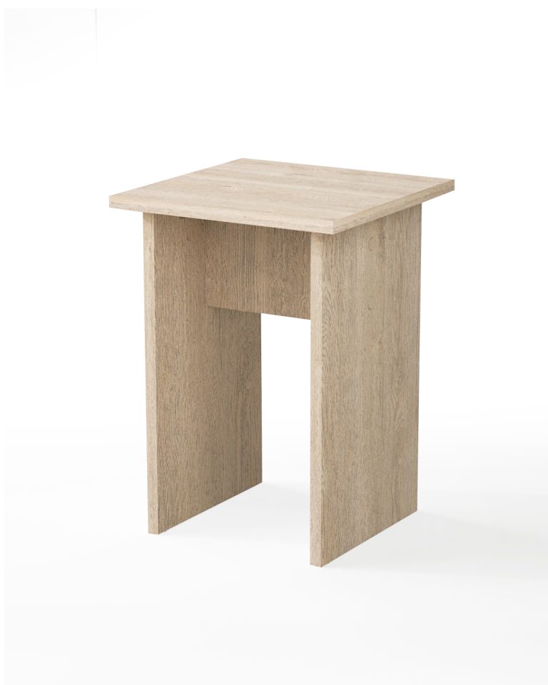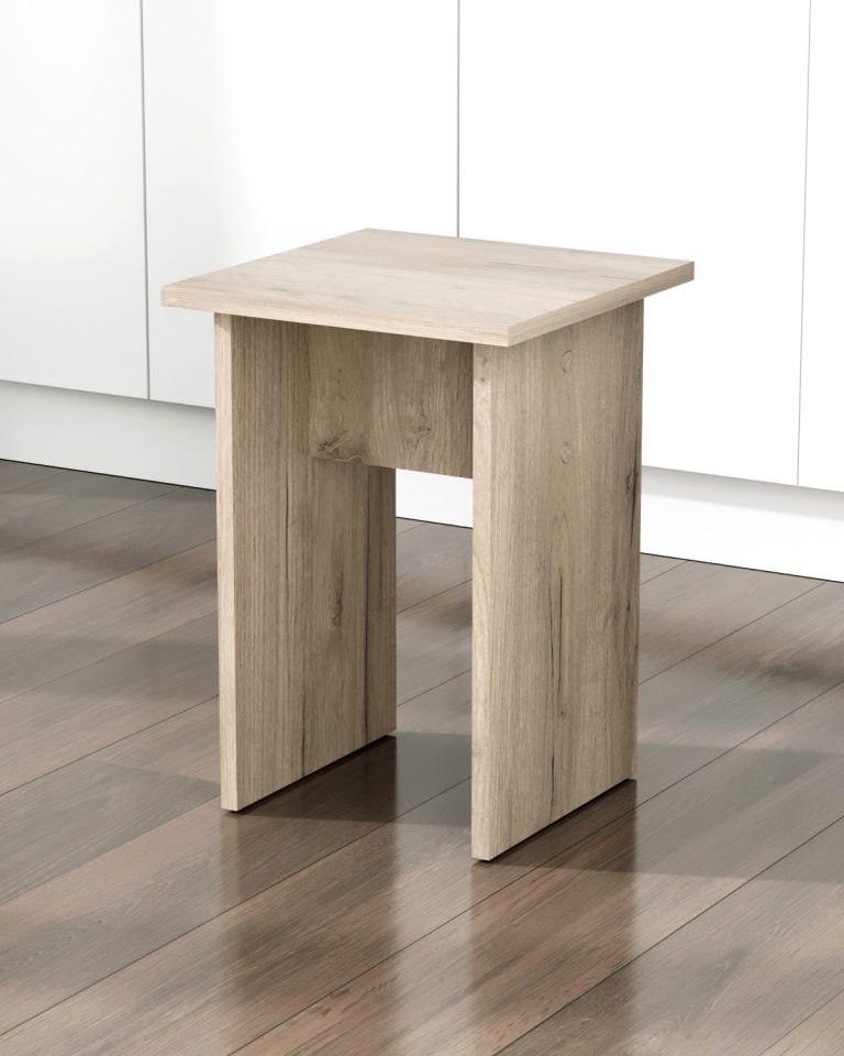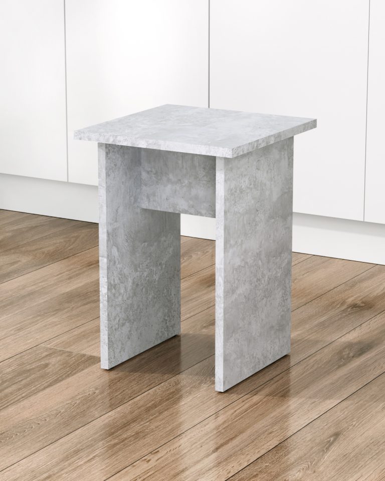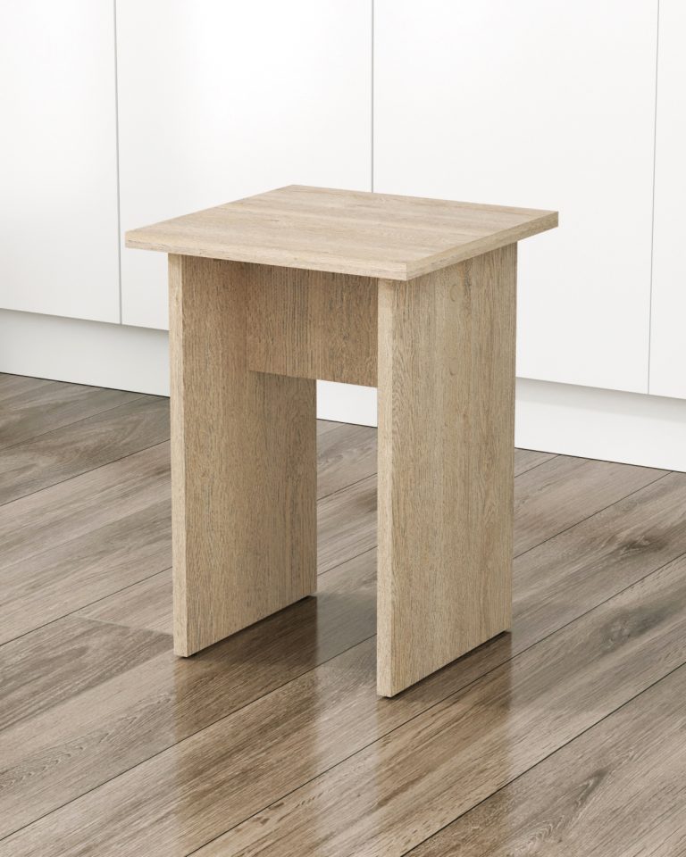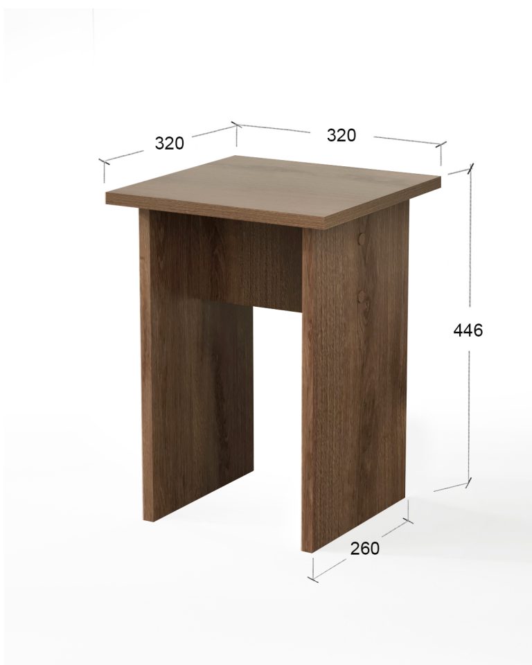 Табурет изготавливаются из распространенного и недорогого материала – ламинированное ДСП 16мм. Материал обладает повышенной устойчивостью к царапинам и повреждения. Края обработаны кромкой.