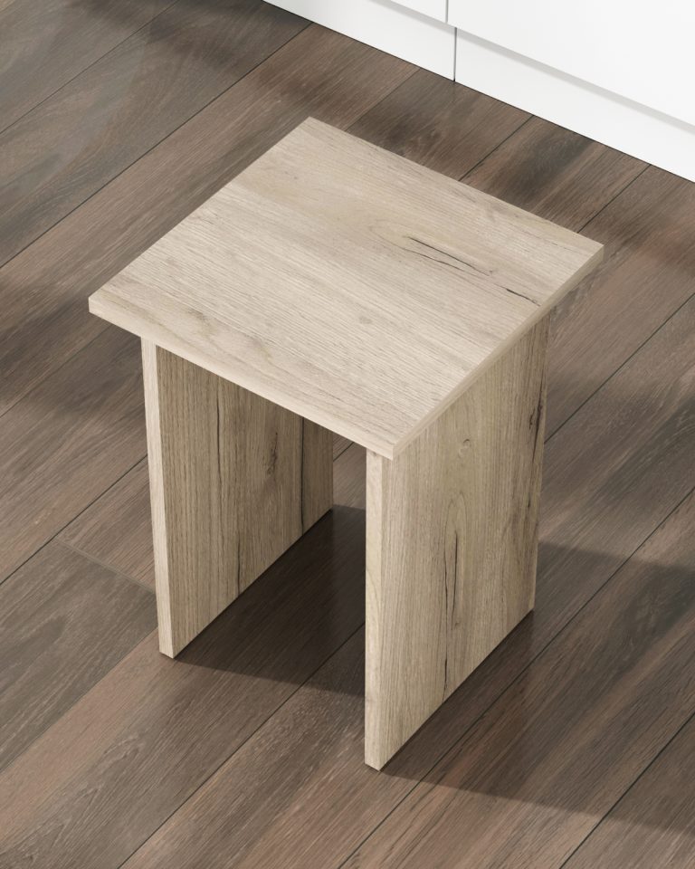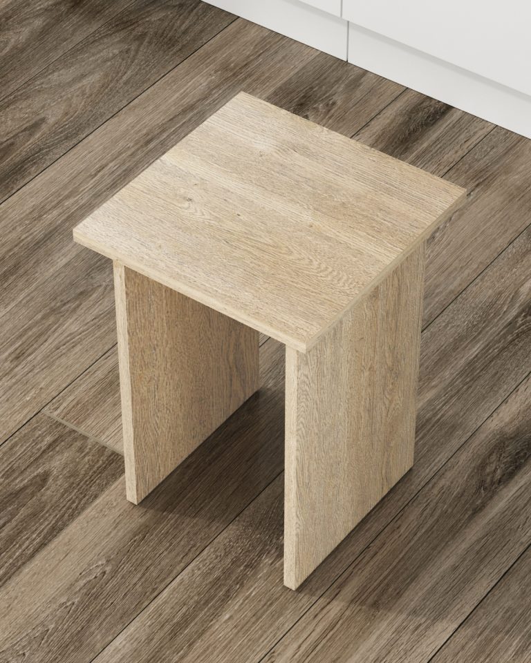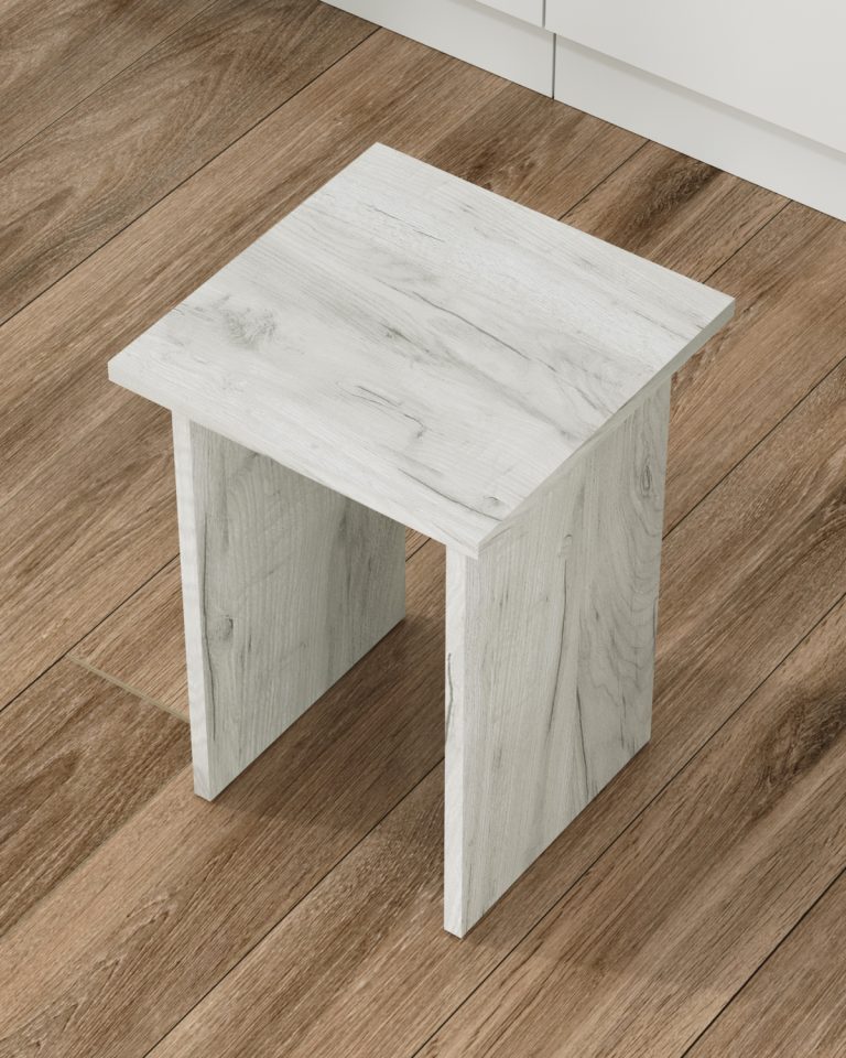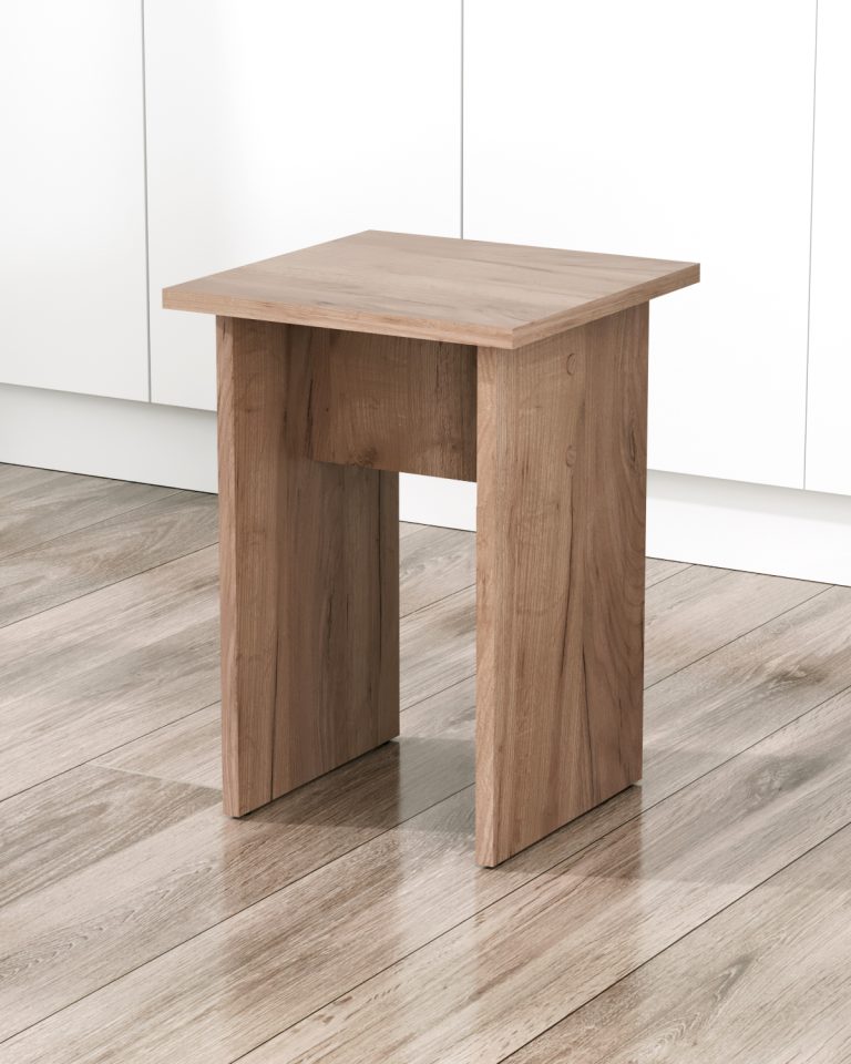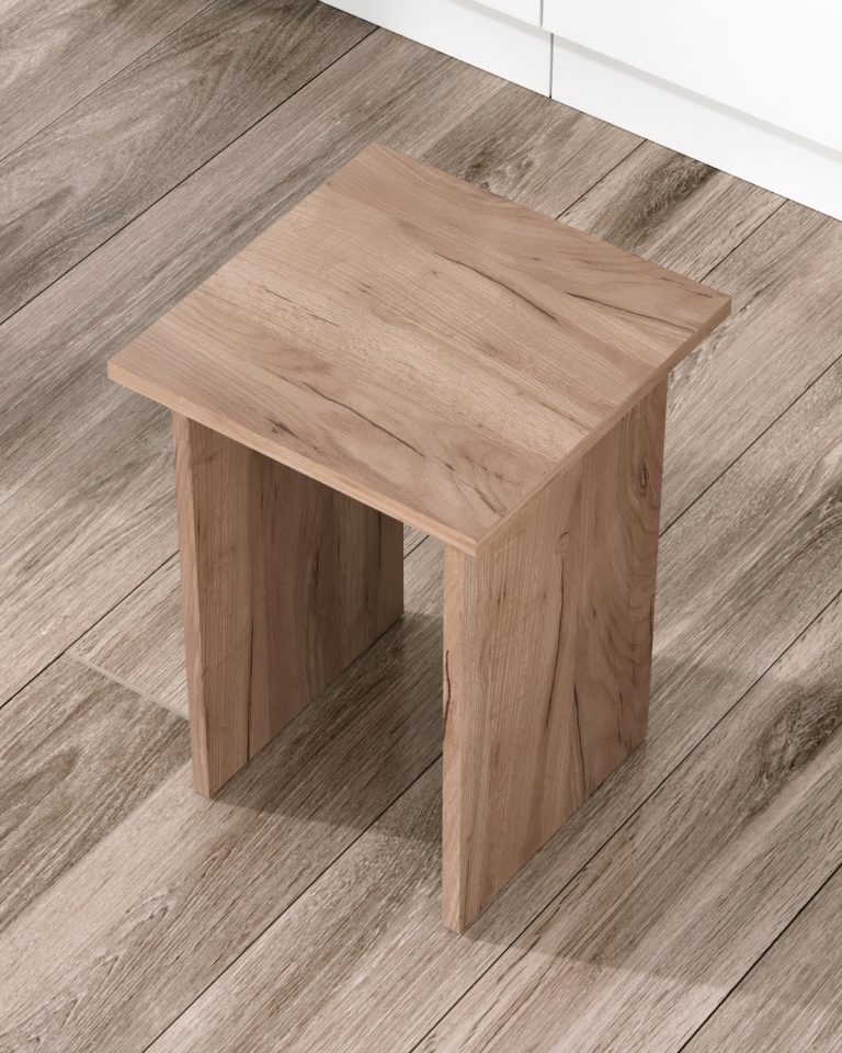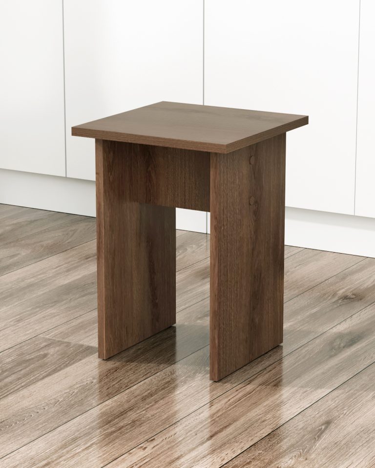 Табурет изготавливаются из распространенного и недорогого материала – ламинированное ДСП 16мм. Материал обладает повышенной устойчивостью к царапинам и повреждения. Края обработаны кромкой.