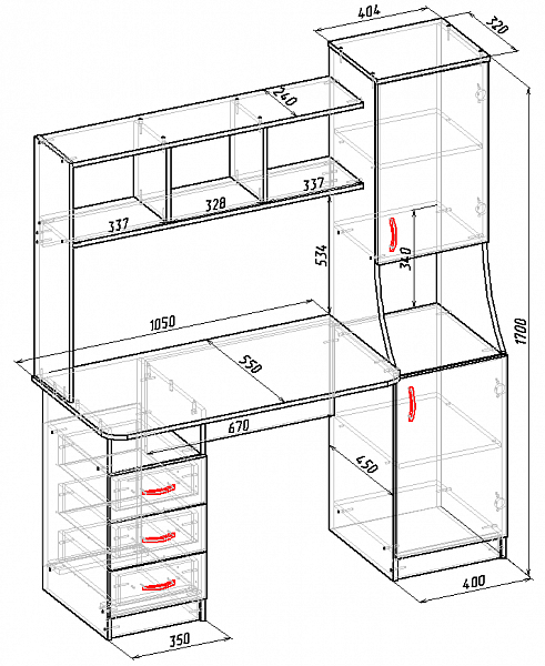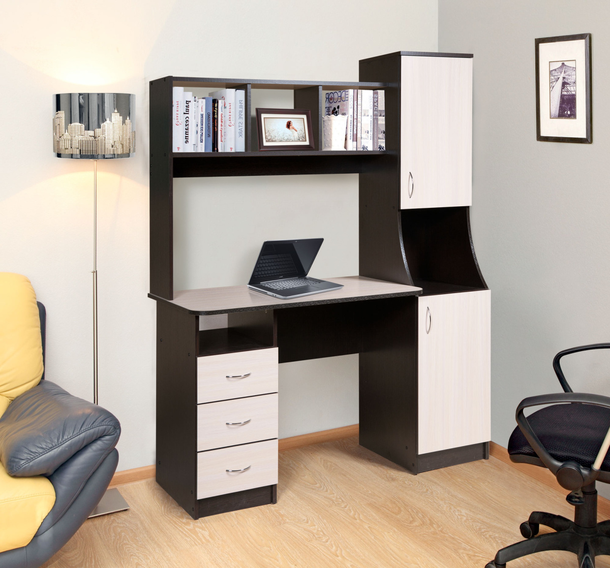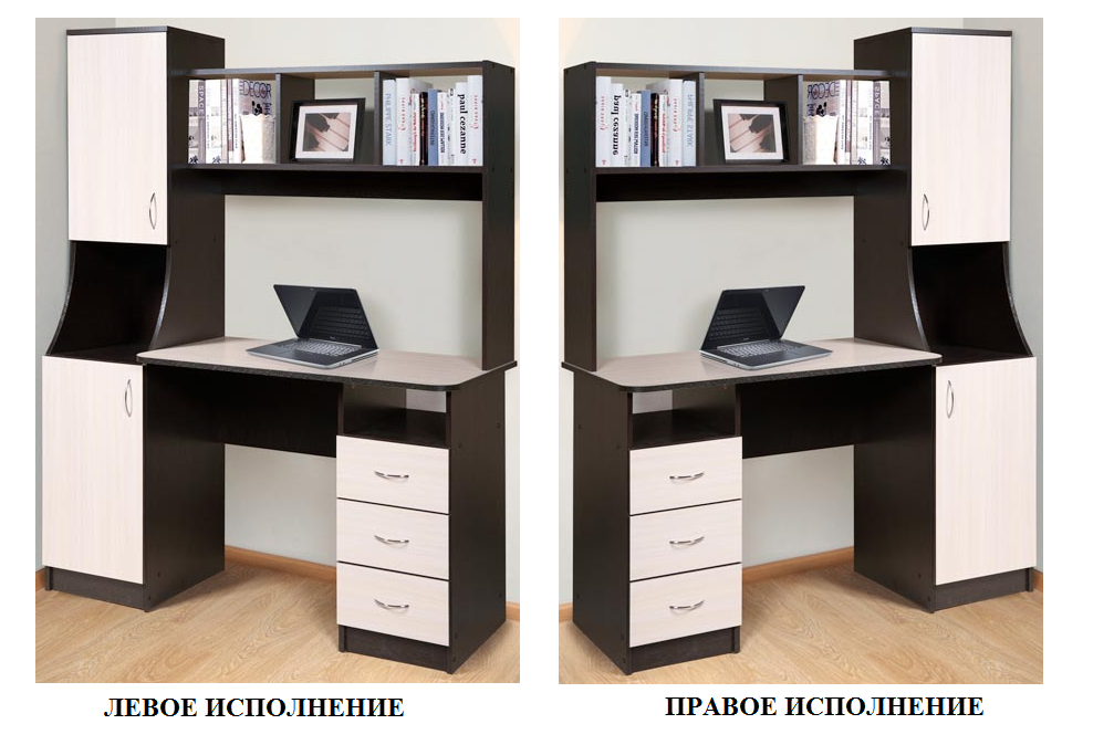 Стол выполнен в классическом компактном варианте - удобная столешница, надстройка, тумба с ящиками, шкаф для книг. Вместительная столешница разместит ноутбук или монитор с клавиатурой, оставив свободное место для документов и учебных пособий. Под столешницей оборудована открытая ниша, которые сохранят «под рукой» все первоочередное. Справа у стола расположена тумба с тремя вместительными выдвижными ящиками, для хранения деловых бумаг и канцтоваров. В открытых нишах надстройки отлично разместятся справочники, учебники, папки с документами. Пенал с двумя закрытыми распашными дверками и открытой вместительной нишей. Шкаф идеально дополняет общий «деловой ансамбль», добавляя место для размещения Вашей библиотеки, семейного архива или любимой коллекции. Стильный дизайн позволяет столу стать равноправным элементом современного интерьера.