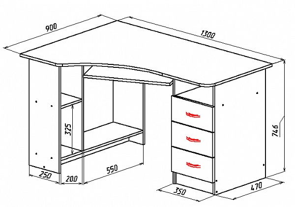 Основа стола - большая, эргономичная, закругленной формы столешница с выдвижной полкой для клавиатуры под ней. Под столешницей расположены c одной стороны - тумба с тремя выдвижными ящиками и открытой нишей, с другой стороны - открытые полочки. Тумба - царство канцелярии и деловых бумаг, а полочки образуют нишу для системного блока и папок. Всё необходимое будет буквально «под рукой».