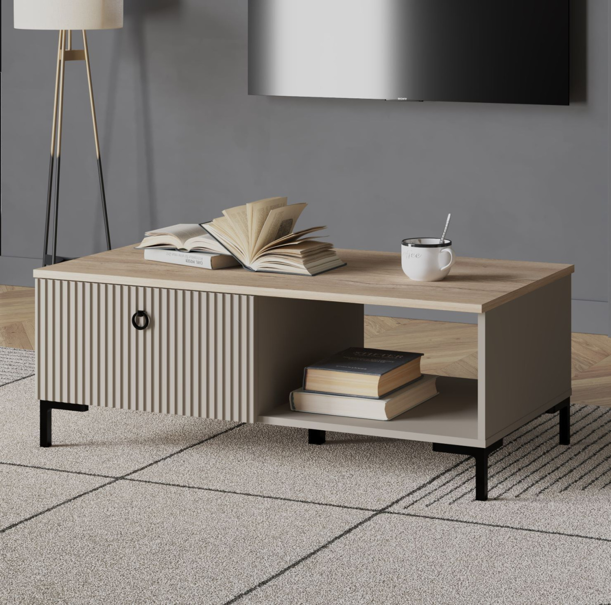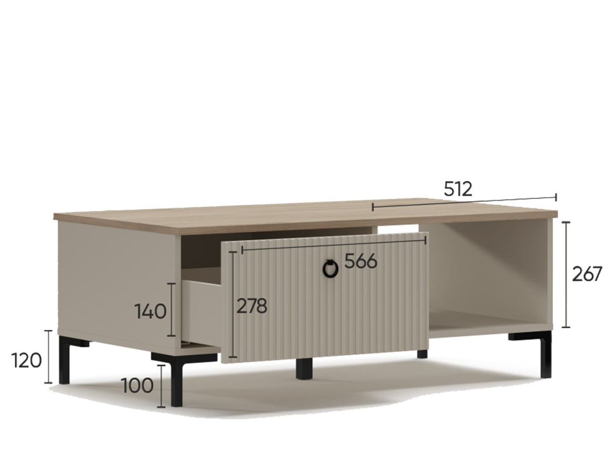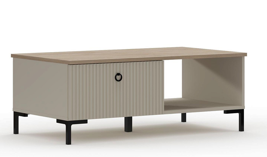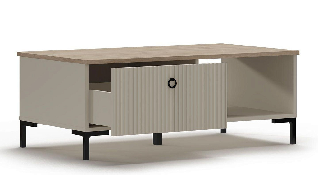 В левой части выдвижной ящик на шариковых направляющих частичного выдвижения с рифлеными фасадами, в правой — открытое отделение для хранения;