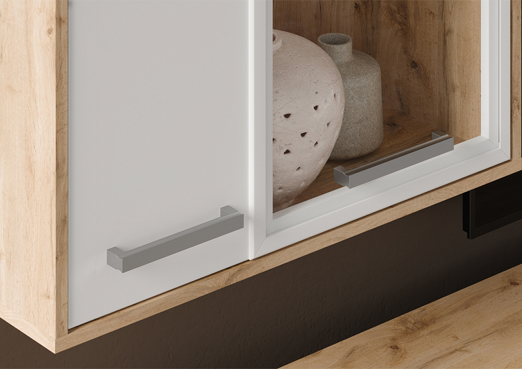 - справа, за распашной дверью со стеклом размещены 2-е стеклянные полки;