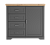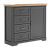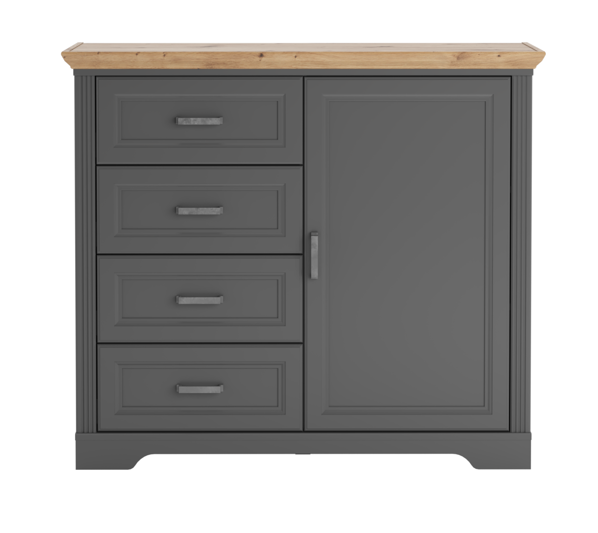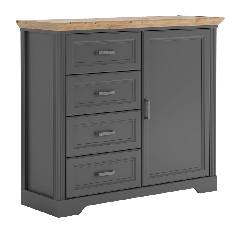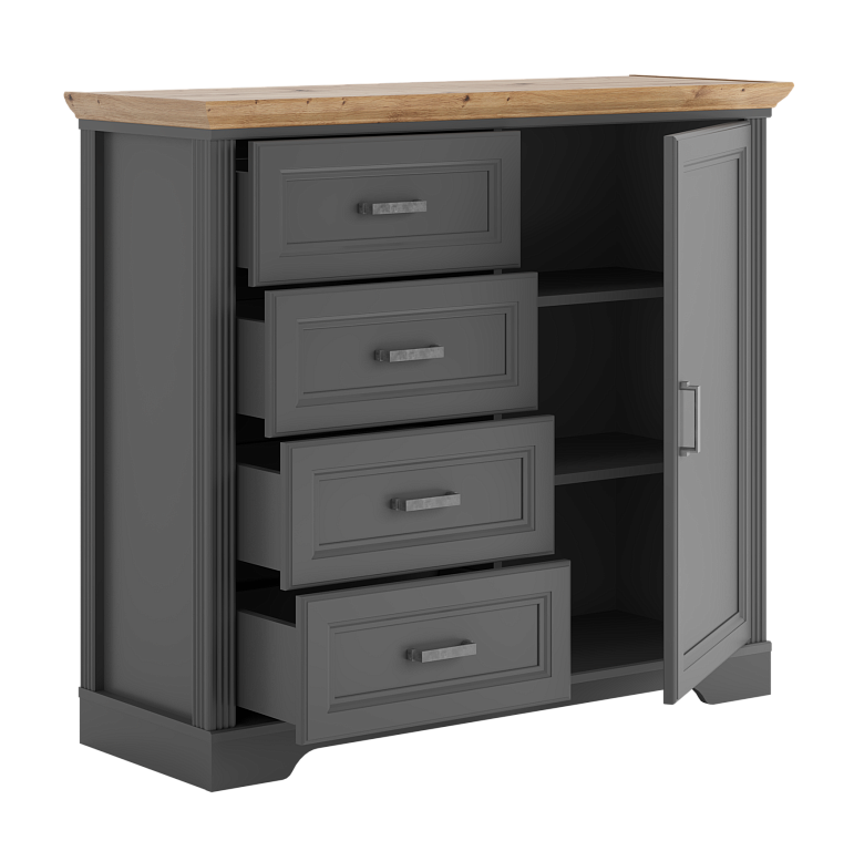 В левой части тумбы расположены 4 выдвижных ящика на шариковых направляющих, в правой — 1 распашная дверь;