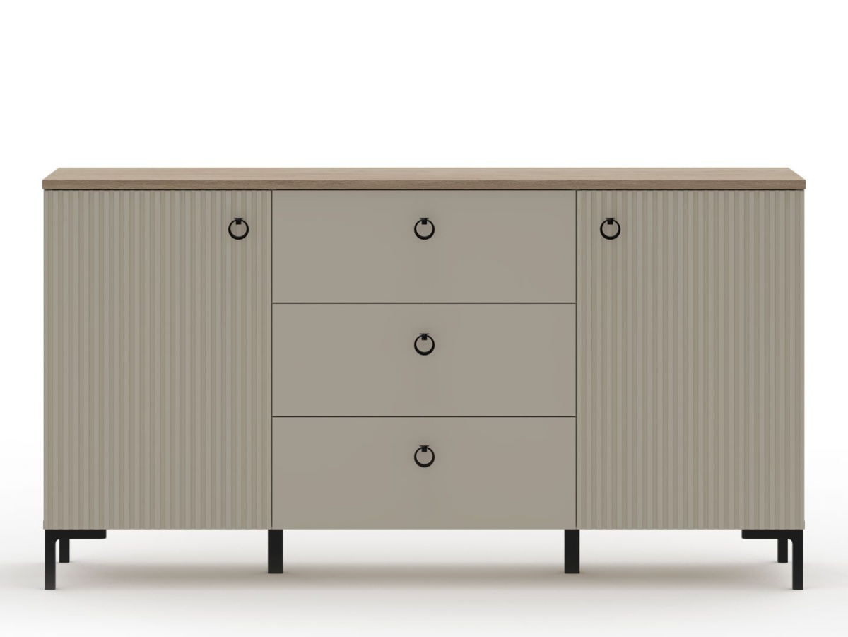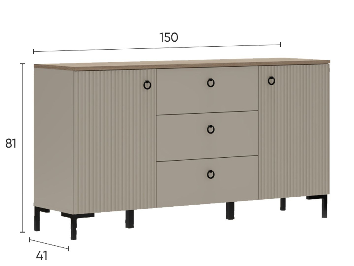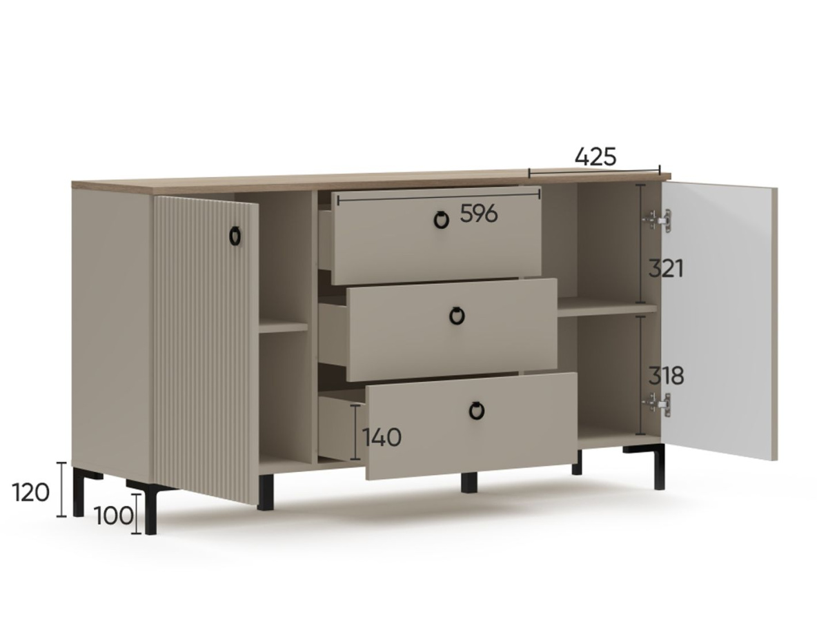 В правой и левой части тумбы расположены распашные двери с рифлеными фасадами; за каждой из дверей — по 2 вместительных отделения для хранения;
