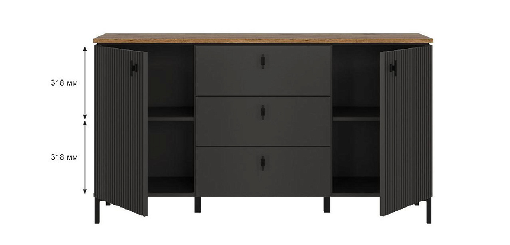 В правой и левой части тумбы расположены распашные двери с рифлеными фасадами; за каждой из дверей — по 2 вместительных отделения для хранения;