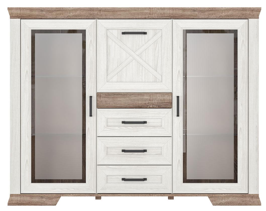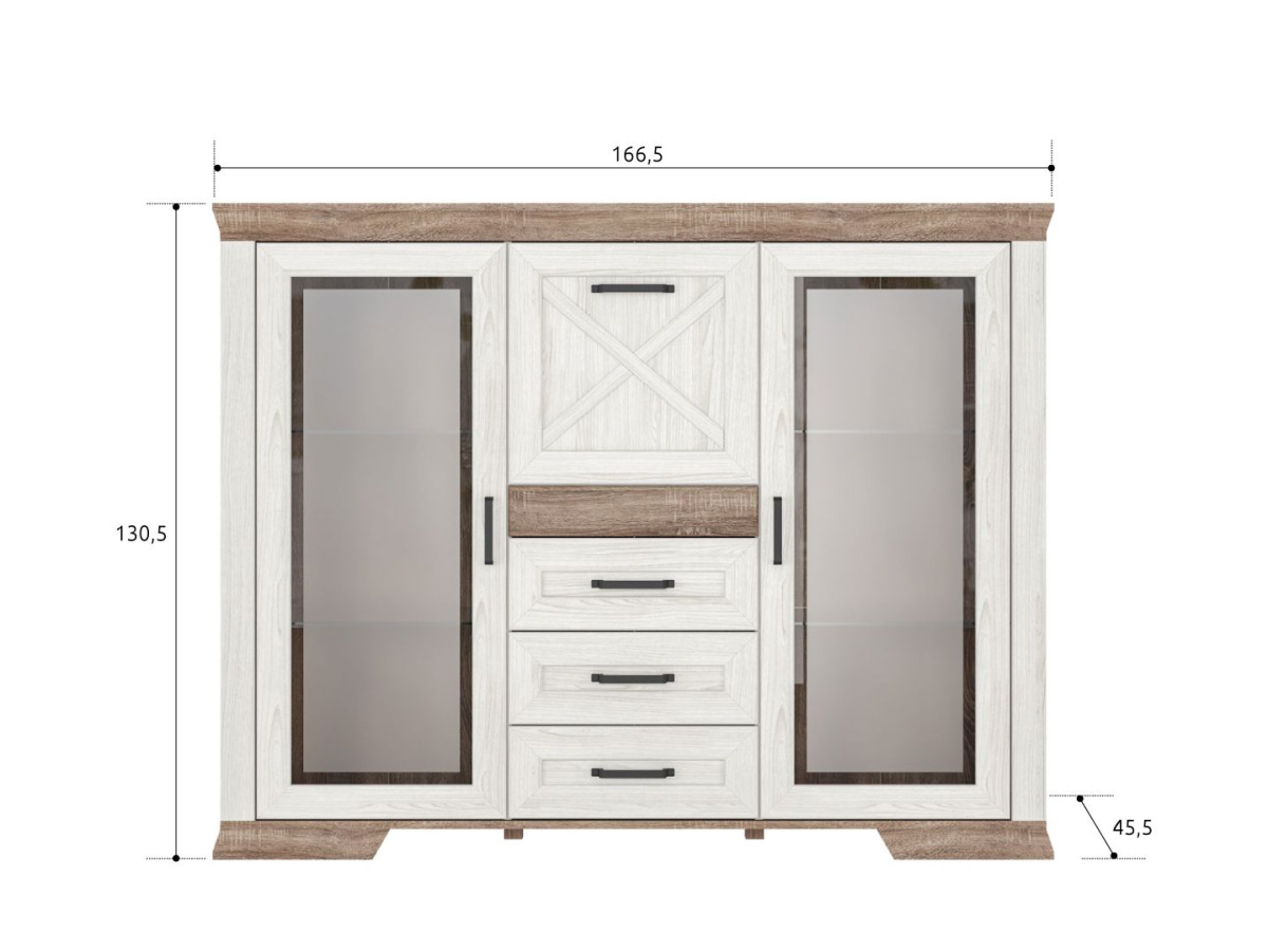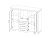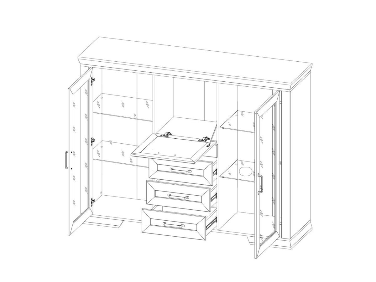 Тумба разделена на 4 отделения: 2 отделения с полками за распашными дверями со стеклянной вставкой, отделение в центральной части за откидной дверью и 3 выдвижных ящика на металлических роликовых направляющих;