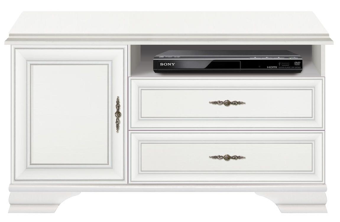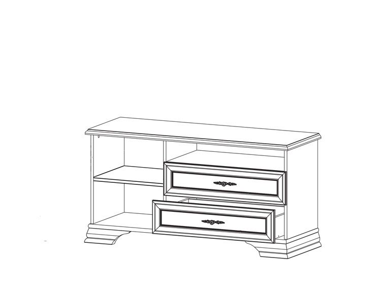 Хранение в тумбе организовано следующим образом: открытая ниша, 2 выдвижных ящика на металлических роликовых направляющих и отделение с полкой за распашной дверью;