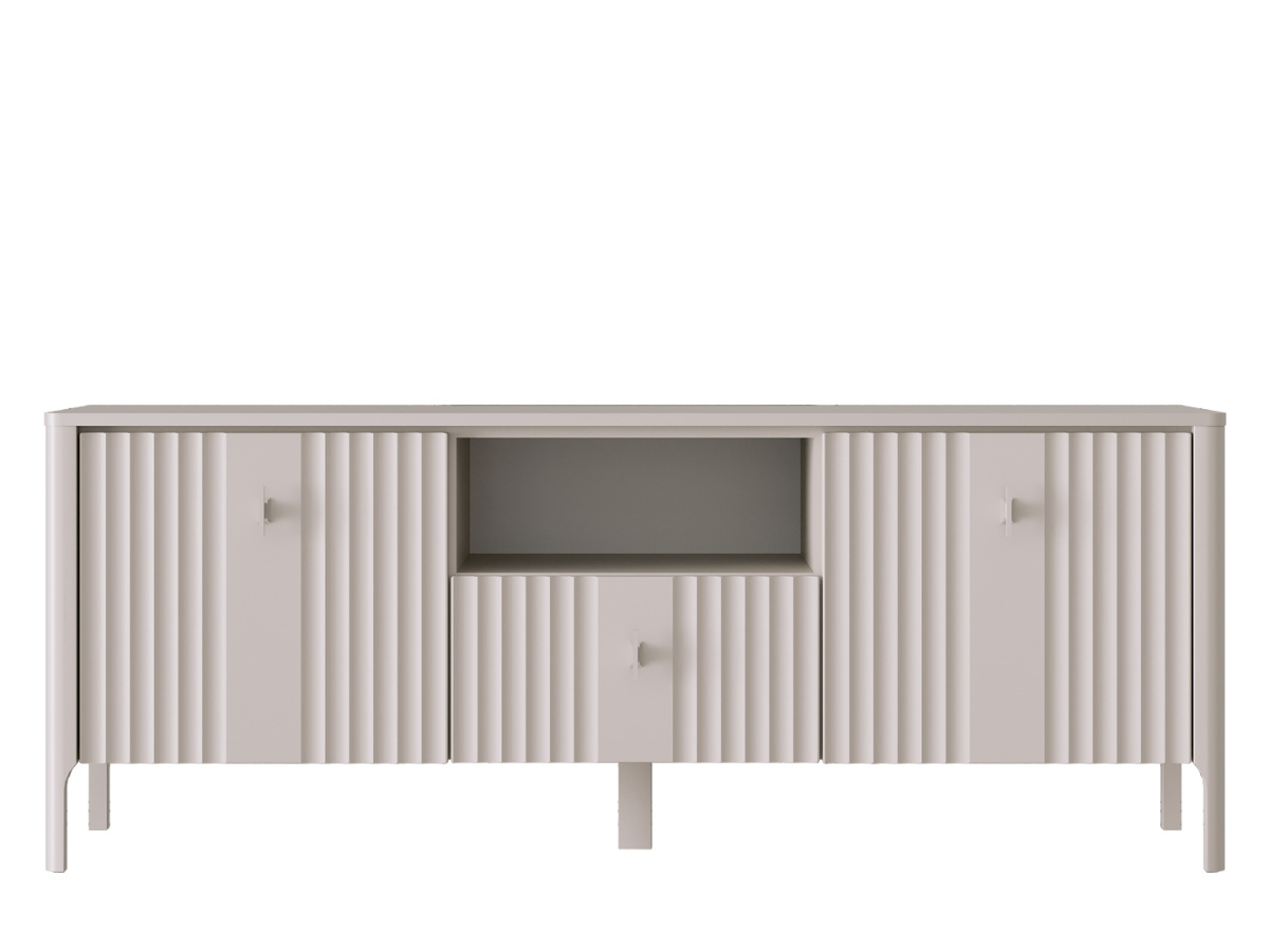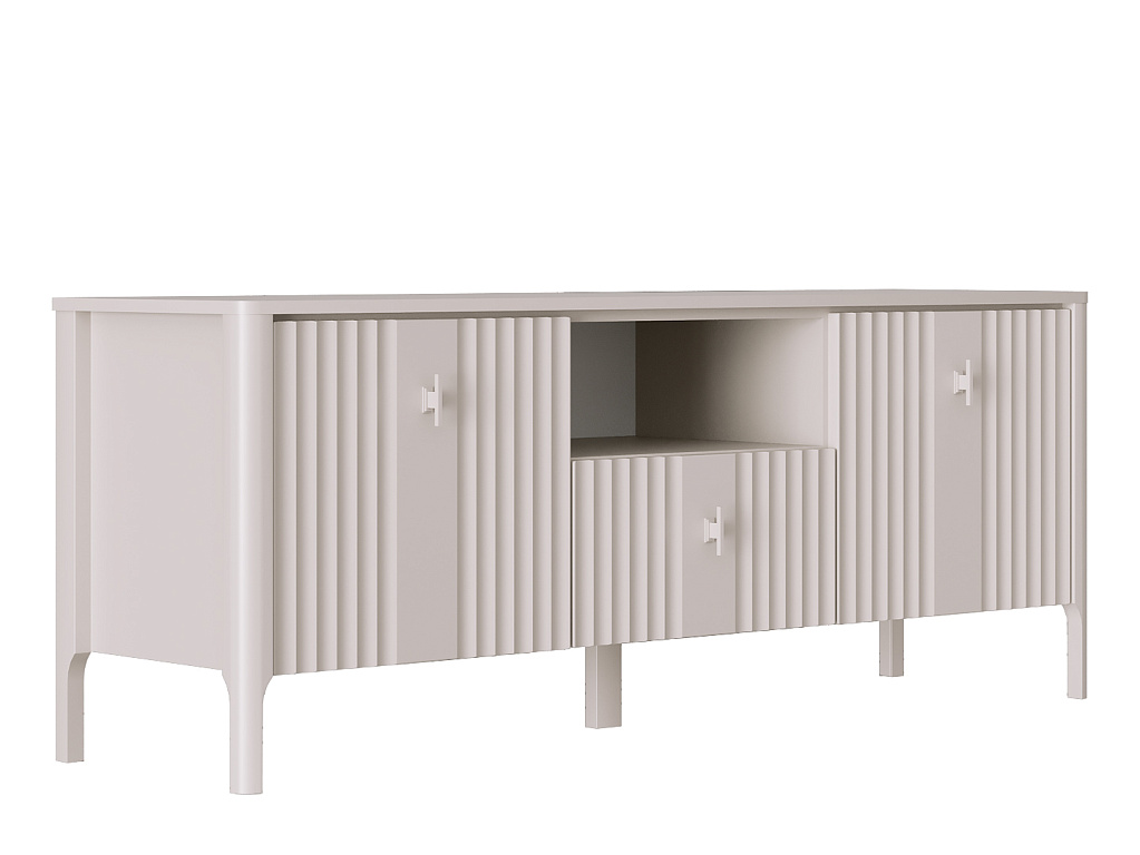 В правой и левой части тумбы расположены двери из МДФ с рифленой текстурой; за каждой из дверей по 2 вместительных отделения для хранения;