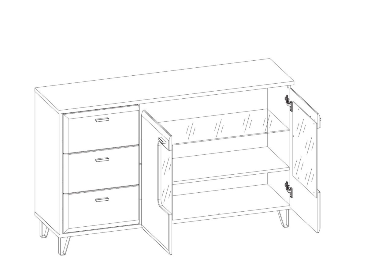 2 распашные двери со стеклом, за которыми расположены 1 стеклянная и 2 стандартные полки;